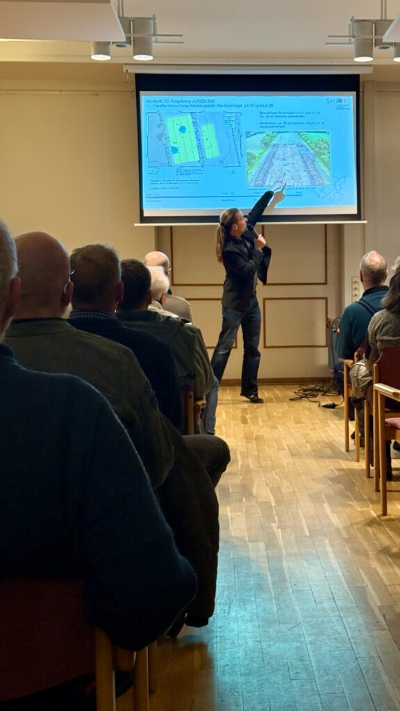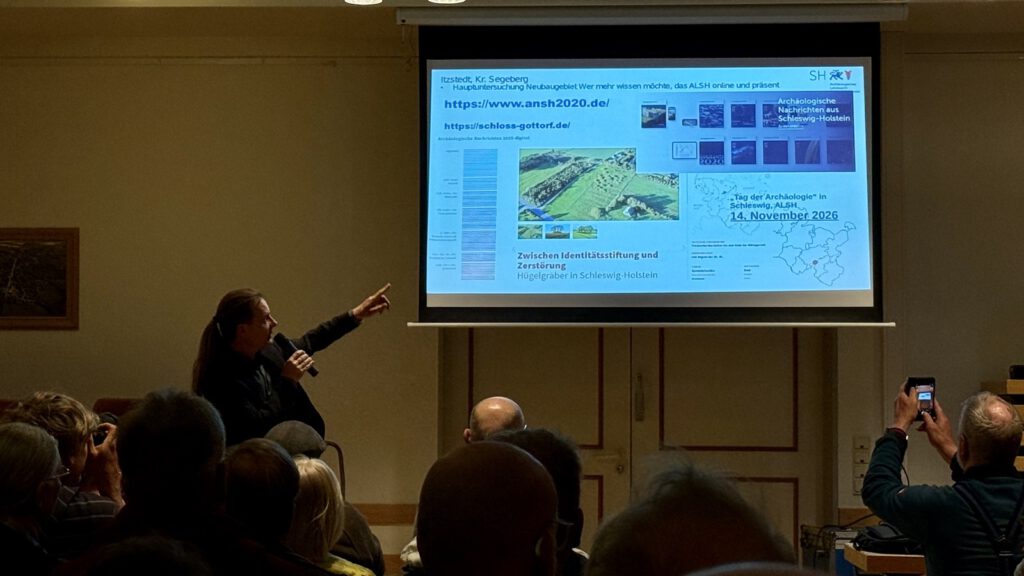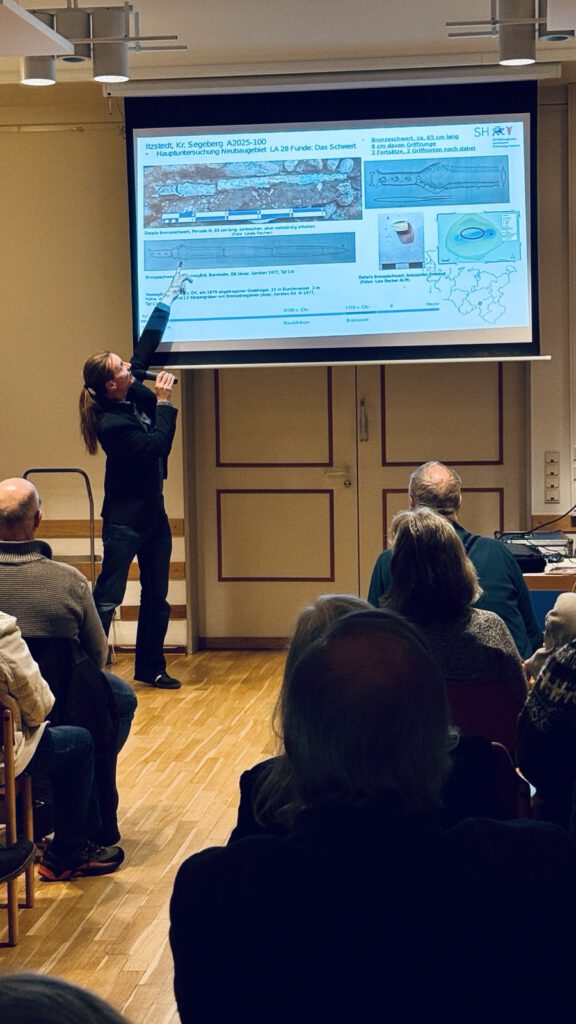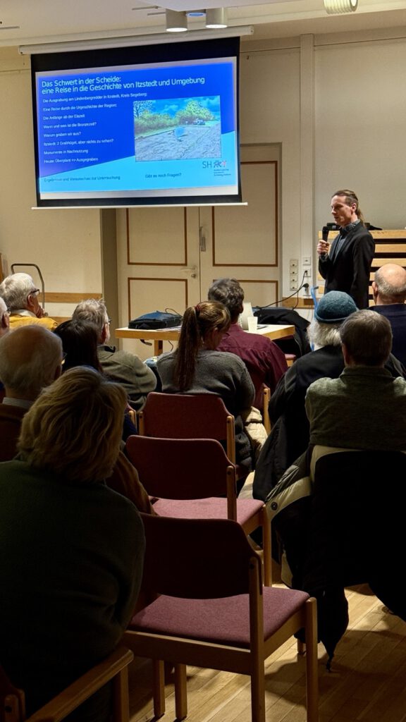 Grabungsleiter Matthias Lindemann vom Archäologischen Landesamt Schleswig-Holstein gab spannende Einblicke in die aktuellen Ausgrabungen in Itzstedt. Auf den Flächen eines geplanten Wohngebiets wurden bronzezeitliche Grabhügel untersucht – mit einem besonderen Fund: einem rund 65 cm langen Bronzeschwert, das als außergewöhnlicher Fund gilt.